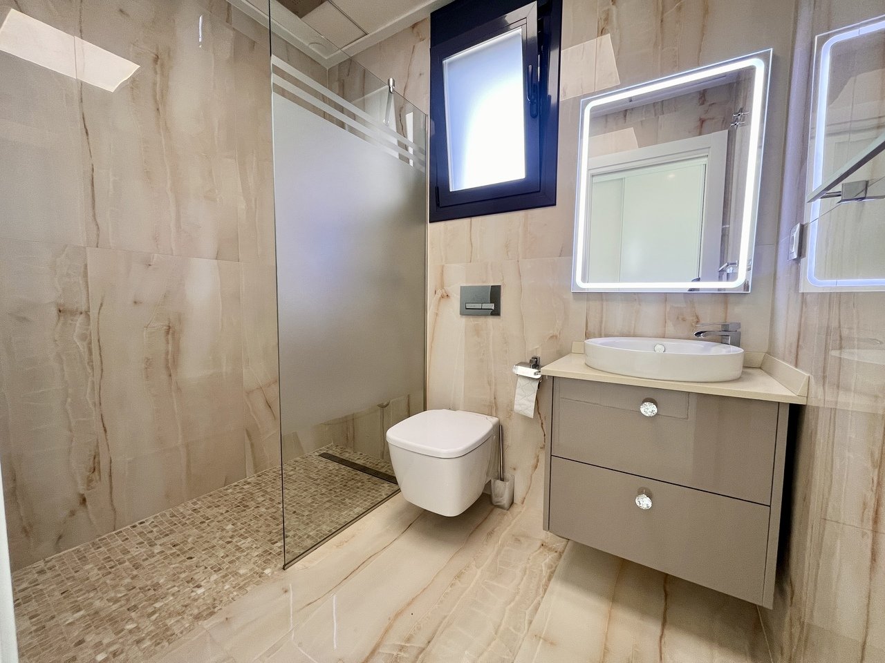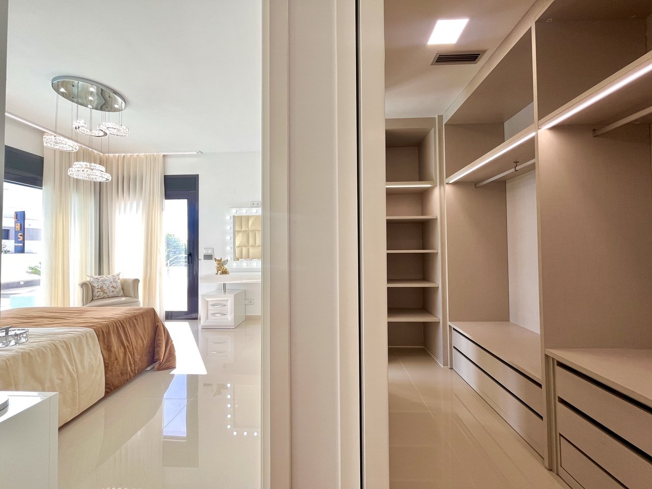 Welcome to this exceptional recently-built luxury villa at Residencial Bellavista, San Miguel de Salinas, offering a harmonious blend of contemporary design and breathtaking views. With a total of 5 bedrooms and 4 bathrooms, this meticulously crafted property spans two floors and a basement, accessible via a convenient elevator and a stunning glass staircase with interior lighting.The basement unfolds into a versatile game room with billiards and table football, a spacious celebration room featuring a full kitchen, 2 bedrooms, 2 storage rooms, and a well-appointed full bathroom. The main floor showcases a seamless living-dining space with an open-concept kitchen and central island, complemented by the main bedroom with an en-suite bathroom. Additionally, a laundry room and a guest toilet enhance the practicality of this level.Ascending to the first floor, you’ll discover two generously proportioned bedrooms, two bathrooms, and access to charming balconies. The crowning jewel of this luxury villa is the top-floor 70m² solarium, providing an unparalleled vantage point to savor panoramic views.This property boasts an array of sophisticated features, including air conditioning, a dedicated parking area for multiple vehicles, central heating with underfloor heating throughout, and an elegant furnishing scheme featuring designer furniture. Noteworthy equipment encompasses a pellet machine for heating, solar panels, an electric water heater, security windows and doors, and a comprehensive security system with sensors in every room.The residence is thoughtfully equipped with high-quality amenities such as motorized sofas, brand-new mattresses, a steam oven with pyrolysis, and a combo fridge that dispenses both normal and crushed ice.The outdoor space is a haven of luxury, featuring a private pool with a cascading waterfall, jacuzzi, and hydromassage. The meticulously landscaped poolside area is adorned with lush vegetation, and a convenient outdoor shower adds to the indulgent ambiance. Ample parking within the plot ensures convenience for multiple vehicles.Situated in Residencial Bellavista, just 7 kilometers from the Orihuela beaches, this enclave is surrounded by golf courses and hosts the area’s premier shopping center with an array of services, bars, restaurants, shops, and supermarkets. Ideal for nature and tranquility enthusiasts, this residence offers a lifestyle of unparalleled elegance and comfort.