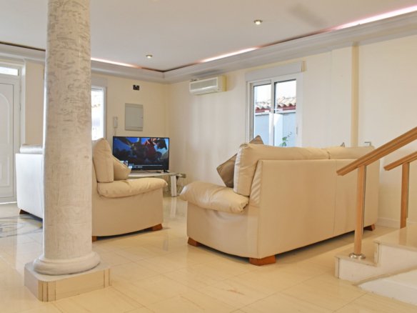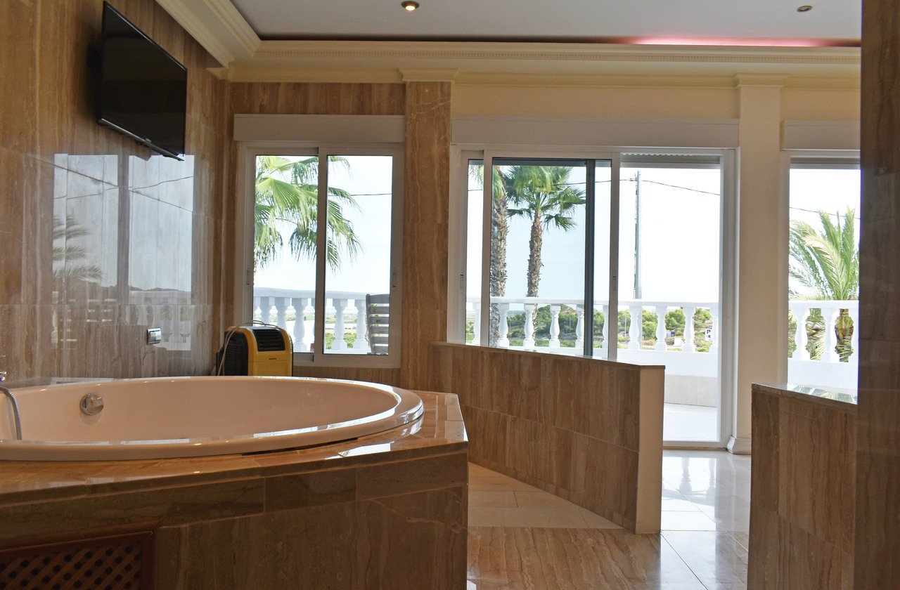 Fantastic spacious villa in green surroundings with proximity to popular golf courses. The location is quiet, private and offers fantastic views of orange groves, the salt lake and the Mediterranean!We reach the property via a pedestrians gate or a wider gate to park the car on the plot. At the front there is a very spacious terrace with pool. We enter the house and arrive in a bright, spacious living room with open plan dining area. Right in front of us we find the separate well-equipped kitchen. On this floor there are also two bedrooms, two bathrooms and laundry room.We go upstairs and find another 3-4 bedrooms and 3 bathrooms. The main bedroom has a jacuzzi, walk-in shower, toilet and balcony with stunning views.Upstairs we find the roof terrace and another room.