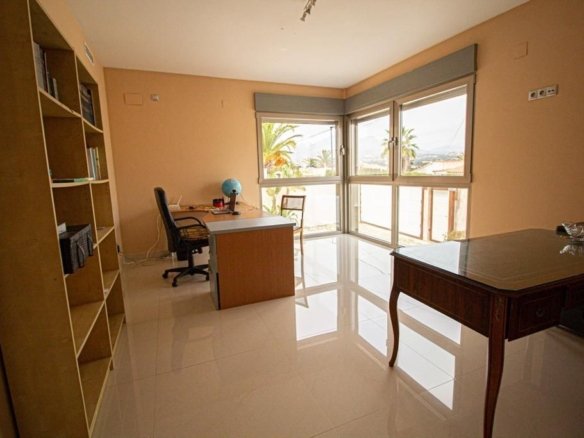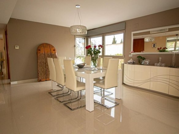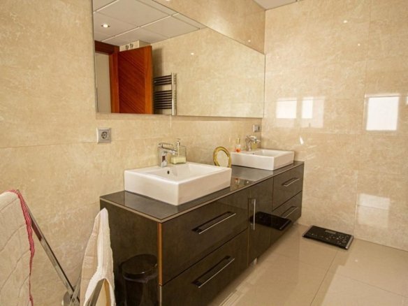 Luxury villa 900 meters from the beach. The plot area is approximately 1250 square metres, of which 355 square metres are in the built-up area. The distribution of the house is as follows: On the main floor there is a master bedroom with a magnificent walk-in wardrobe and an en-suite bathroom with whirlpool bath. Then there is a spacious living room with large windows of 3 meters high, which provides maximum natural light. This living room is connected to the designer kitchen with a beautiful granite island in the middle for cooking comfort. The kitchen also has access to a swimming pool of 61 metros with jacuzzi and waterfalls. Adjacent to the kitchen is a laundry room connected by a pipe to the upper floor for the convenience of transporting laundry. Completing this floor is a guest bathroom and a room that can be used as an office. On the first floor there are four bedrooms, each with its own bathroom and a separate terrace. The first floor offers a terrace with panoramic views of the city, the sea and the mountains. As for the quality of the finishings, the floor is made of high quality porcelain stoneware and has underfloor heating. The windows are made of triple glazing, providing thermal and acoustic insulation. In addition to all this, the property is equipped with central air conditioning for hot and cold, and there is the possibility of installing a lift according to the floor plan. And finally, there is a magnificent garage of approximately 350 square metres and ceiling height 5 meters for 12 cars with an anti-seismic structure.