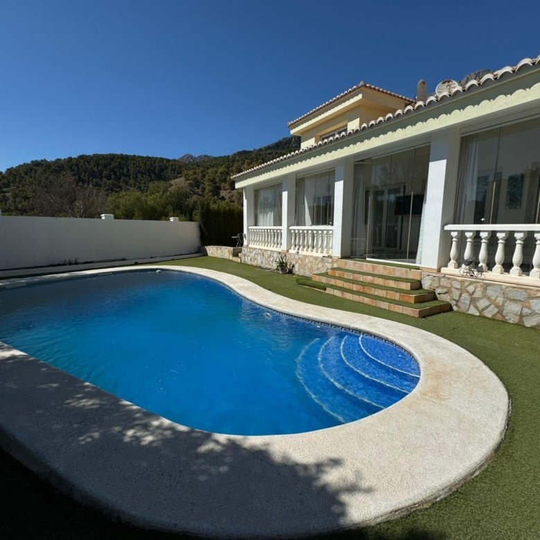 Beautiful villa in Alfas Del PiThis beautiful villa in Alfas Del Pi is ideal for rental or for running a B &B.StudioLiving room with bed, open kitchen with: 2 burner electric hob, fridge, microwave, television, bathroom with shower, sink and toilet.Living roomSofa bed in the living room for 2 people, 1 bedroom with 2 single beds, fully equipped kitchen with: 4-burner gas stove, oven, fridge, microwave, bathroom with: shower, toilet, sink3 bedroom apartment downstairsLiving room with loft where extra bed for 5th person can be placed, 2 bedrooms, both with 2 single beds, fully equipped open kitchen with: 4-burner gas cooker, microwave, fridge,bathroom with:walk-in shower, washbasin, toilet, ceiling fans3 bedroom apartment upstairs2 spacious bedrooms, a bathroom with shower, bath and toilet. In addition, there is a separate toilet, very spacious kitchen with all necessities, two spacious terraces, one of which has sea views. This apartment can accommodate up to 4 peopleThe outdoor area contains several terraces, a very large covered outdoor kitchen and a beautiful swimming pool