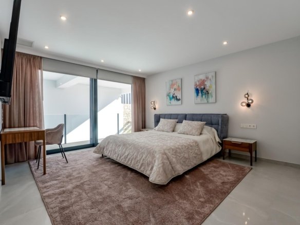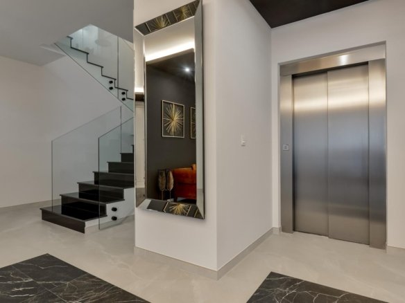 NEW BUILD LUXURY VILLA IN FINESTRAT WITH THE SEA VIEWS New Build Luxury villa with the sea views in Sierra Cortina, Finestrat. Arriving at the Urbanisation there is a natural stone wall with a height of 7 metres and the automatic access gates to the villa arriving at the covered garage at street level with double height, natural light and garden with palm trees of different heights of 180 m2, a glazed room of 78 m2 with lift, interior staircase, cloakroom and enough space to put armchairs, convert this space into an office or simply a waiting room for visitors. The next floor of 190 m2 of enclosed space is located below the plot level but 3 metres above the street level and therefore with natural light. It can be accessed by lift or staircase inside the villa, or by the staircase outside the garage, in the latter case you can only access the exterior corridors, the installations room or the main door of this floor, thus making the maintenance of the house without the need to enter inside the house. Inside this floor we will find 4 spacious bedrooms, living room with English patio of 17 m2 with the stairs to the plot, laundry, 2 bathrooms, exterior corridors of 40 m2 and installations room. When we go up to the main floor by 3 access ways we see a living room of 130 m2 with double light, open kitchen, guest toilet, panoramic sea views, and swimming pool of 54 m2 of laminate, a beautiful garden and 2 large covered terraces. To the bedrooms floor we access by lift or interior staircase where we will see a Master Bedroom of more than 50 m2 with en-suite bathroom, dressing room and terrace, two bedrooms of about 20 m2 each one, a bathroom and the terrace for these bedrooms. Villa is equipped with Led exterior and interior, underfloor heating, domotics, high Gamma crystals, centralized air conditioning, automatic blinds, high ceilings and much more: Living room- 95 m2 Bedrooms- 8 (main 52 m2 and secondary 20 m2) Bathrooms- 5 Plot- 890 м2 Built- 998 м2 Swimming pool- 12 X 5 Four Floors Garden (20 m2) – fully finished with automatic irrigation system Lift (Otis) inside the house Underfloor heating Domotics (control of air conditioning, underfloor heating, interior and exterior lighting, blinds) Electric blinds Exterior and interior lights brand name Siemens High ceilings up to 3,20 m high Impressive sea view One floor for guests Aerothermal heating Fully fitted kitchen with island Fitted wardrobes Porcelain tiled floor Wall with natural stone hand carved Garage for 4 vehicles with automatic doors 160 m2 + entrance hall 78 m2 Open parking 37 Villa located in the Sierra Cortina resort complex, next to two golf courses, theme parks, a large shopping centre and a few minutes from the beaches of Benidorm. Finestrat located in the Marina Baixa region of the Costa Blanca, close to neighbouring Benidorm and about 40 kilometres from the city of Alicante and the international airport. The village is situated on the mountainside of Puig Campana and offers beautiful views of the mountains, the coast and the Mediterranean Sea.
