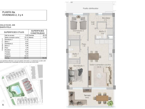 NEW BUILD RESIDENTIAL COMPLEX IN SANTA POLA Modern gated residential complex comprising 3 blocks of apartmwnts with large landscaped communal areas including a swimming pool with water beds, children’s playground, pergola and bicycle parking. The residential has 3 and 2 bedrooms apartments, both types include 2 full bathrooms, open plan kitchen with living room, fitted wardrobes, terrace, parking space. They have a common garden , swimming pool with beach-type entrance, equipped with showers and a large wooden pergola. It has landscaped areas with palm trees and vegetation, all of which are illuminated. In the central part of the pool there is a shallower area where the water beds are located. The municipality of Santa Pola is located on the popular Costa Blanca on the Mediterranean, south of Alicante and in the Bajo Vinalopó region. The city is in an enviable geographical position, surrounded by natural landscapes and with a special microclimate, which offers a mild climate all year round. Its urban center is bounded by the Castle Fortress and the port to the east and west, and is bordered by the Santa Pola Salinas Natural Park and the Sierra and Cabo de Santa Pola, an ancient reef today characterized by its reef leafy pine trees. Santa Pola located 21 km. from Alicante, the provincial capital with excellent infrastructure and 15 km. away from the international Airport “Elche-Alicante”.