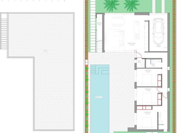 NEW BUILD VILLAS IN LOS ALCAZARES New Build residential of villas and townhouses in Serena Golf, Los Alcazares. Modern villas has 3 bedrooms, 3 bathrooms, open plan kitchen with living area, terrace, solarium, private garden with the pool and parking space. Fully fitted kitchen in white gloss or wood colour. Technological technological quartz. Stainless steel sink. Induction hob with integrated extractor fan, oven, microwave, washing machine, integrated refrigerator, integrated dishwasher. Air conditioning: Complete installation with FUJITSU ducts. Swimming pool: Dimensions according to the property, with steps, blue ceramic tiles and white LED lighting. Pre-installation for heat pump. La Serena Golf is located in the municipality of Los Alcázares, occupying an area of 60 hectares on the edge of the Mar Menor, a perfect natural environment to enjoy the best climate in Europe. Los Alcázares located in the Region of Murcia near the beaches of Mar Menor, where you can practice various water sports, surrounded by several golf courses. Here you can practice various water sports, surrounded by several golf courses and the city of Cartagena less than 15 minutes by car and 22 km from Murcia airport, therefore having a wide cultural, gastronomic and sports offer within reach.