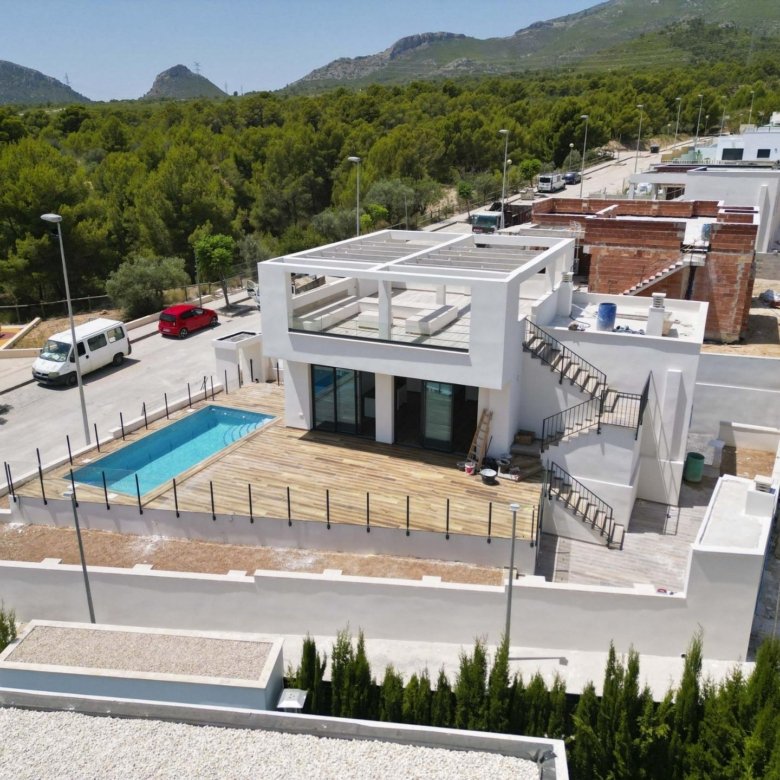 NEW BUILD VILLAS IN POLOP !!! This Villa has been designed to enjoy a VILLA with large plots from 420 to 480 m2 distributed over 120 m2 of living space. The price includes: – Independent plot – Closed perimeter area – Private pool – Parking area with motorized access. – Finished garden, with gravels and ornamental plants – Barbecue The VILLA is distributed over two floors – Ground floor with open kitchen, living room, two bedrooms and a bathroom. – First floor with master bedroom, bathroom en suite and terrace-solarium. Polop is a typical Spanish town 8 km from Benidorm and its beaches and 4 km from La Nucía, considered the city of sports. Mount Ponoig behind these houses not only creates a very favorable microclimate in the area, but also gives you the chance to go on beautiful mountain excursions.